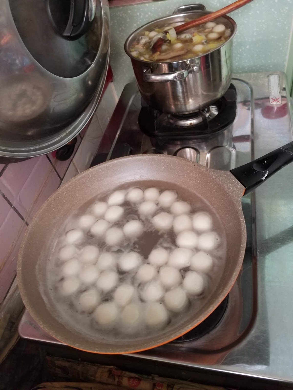 4,糯米粉加水慢慢搓,搓到到成團後,搓成條牀再搓成粒狀,放落已煲滾的水中,中途要搞一搞湯丸,以免痴埋一齊同痴煲底,當湯丸浮上水面代表已熟,不起佢放落步驟3的湯裏面即可食用!